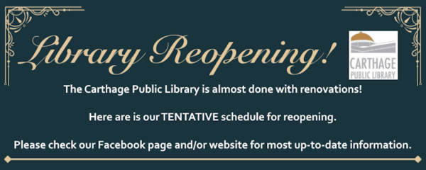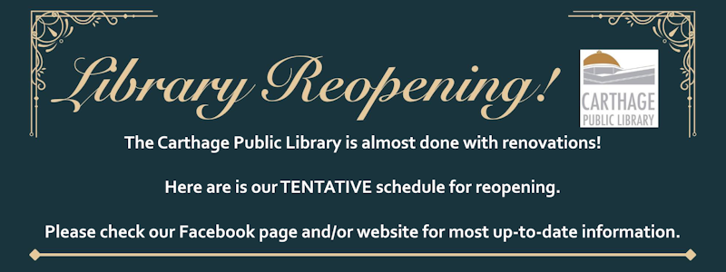 The Carthage Public Library is almost done with renovations! Here is our tentative schedule for reopening. Please check our Facebook page and/or website for the