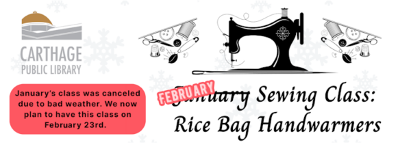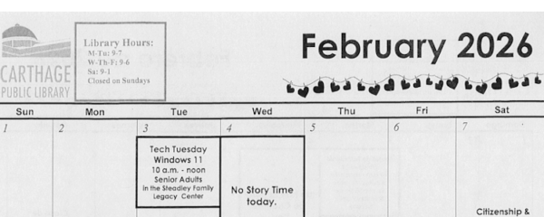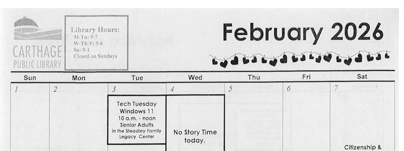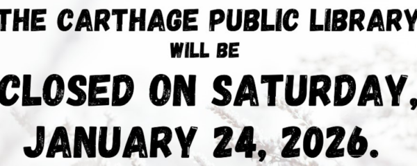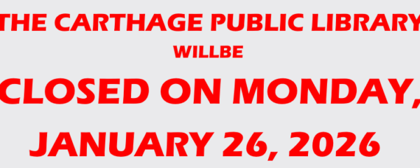 The Carthage Public Library will be closed on Monday, January 26, 2026 due to inclement weather.