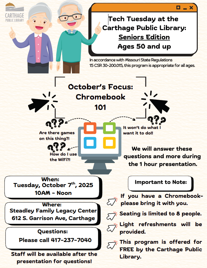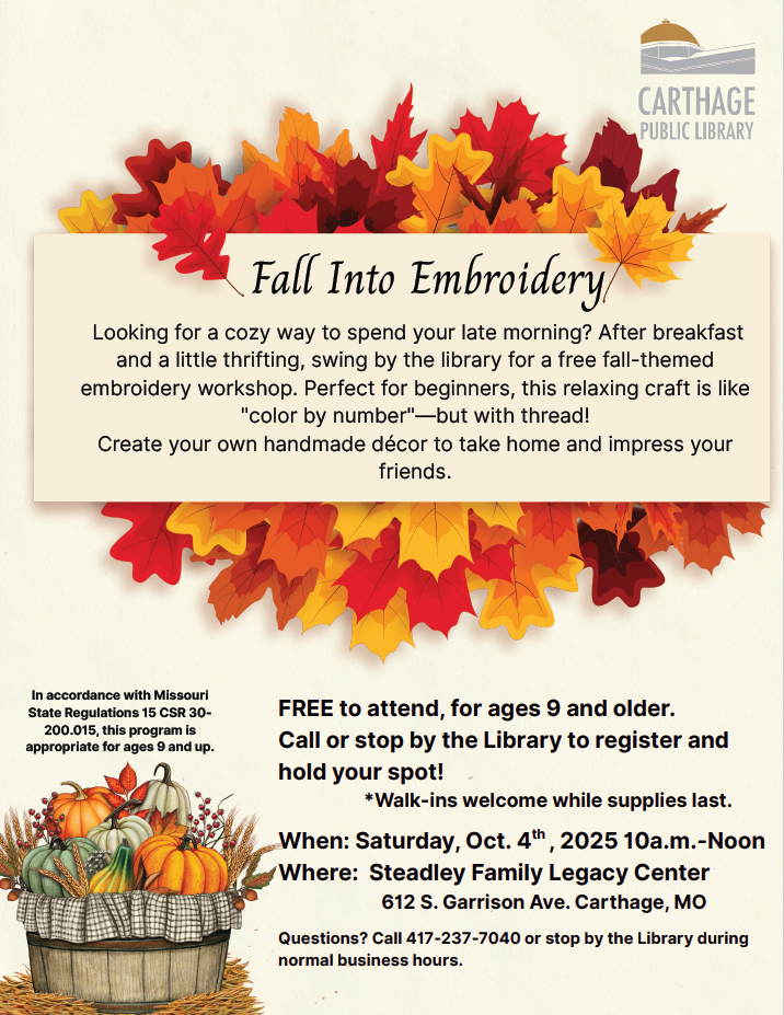 Our Library is no stranger to dealing with renovation and maintenance issues that are out of our control. Beginning Monday, November 3, the Carthage Public Library will be closed for approximately 2–3 weeks while essential projects are completed, however, the duration cannot be guaranteed and may be affected by construction issues, supply chain or other unforeseen factors. Updates will be shared on the Library’s website and social media.