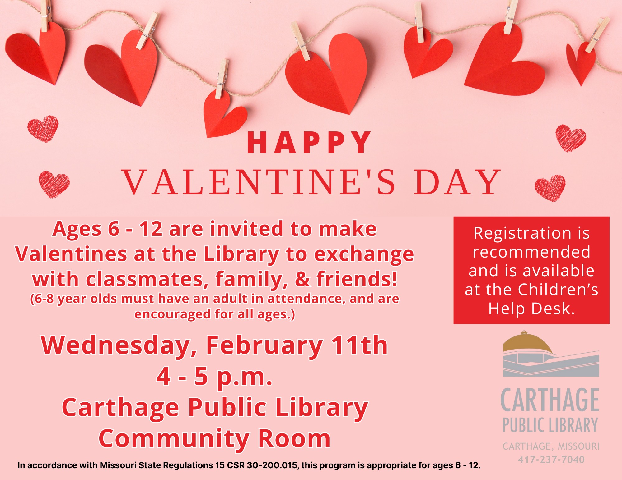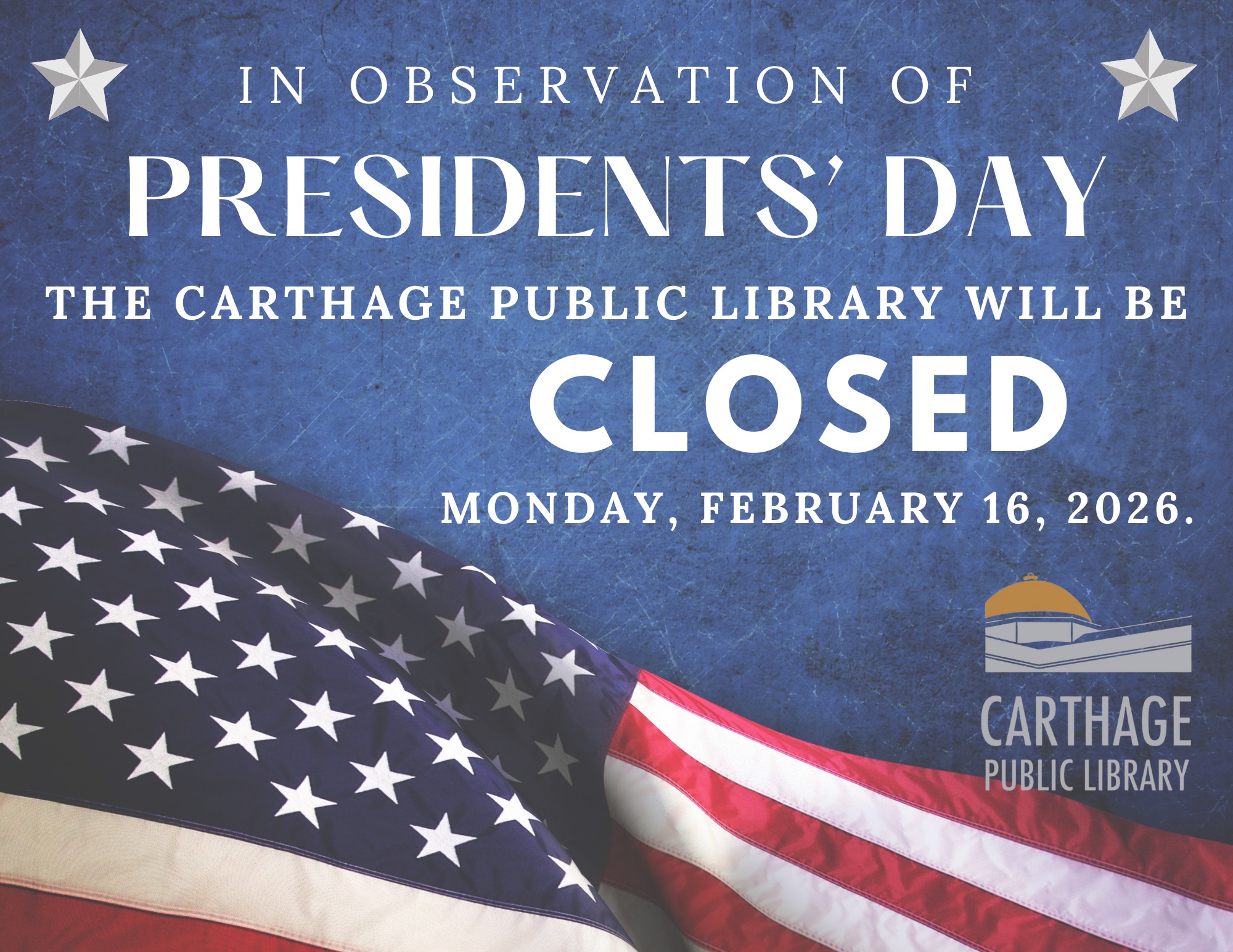 In cases of inclement weather, the Library will be closed when the Carthage R-9 Schools are forced to close. After the first day, we will evaluate the road conditions and will reopen as soon as possible. Check your local TV stations, our website, or Facebook page for updates.