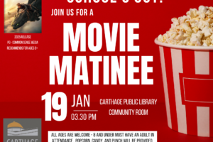 Carthage schools will not have classes on Martin Luther King Jr. Day. Join us at the Library for a FREE Movie Matinee!