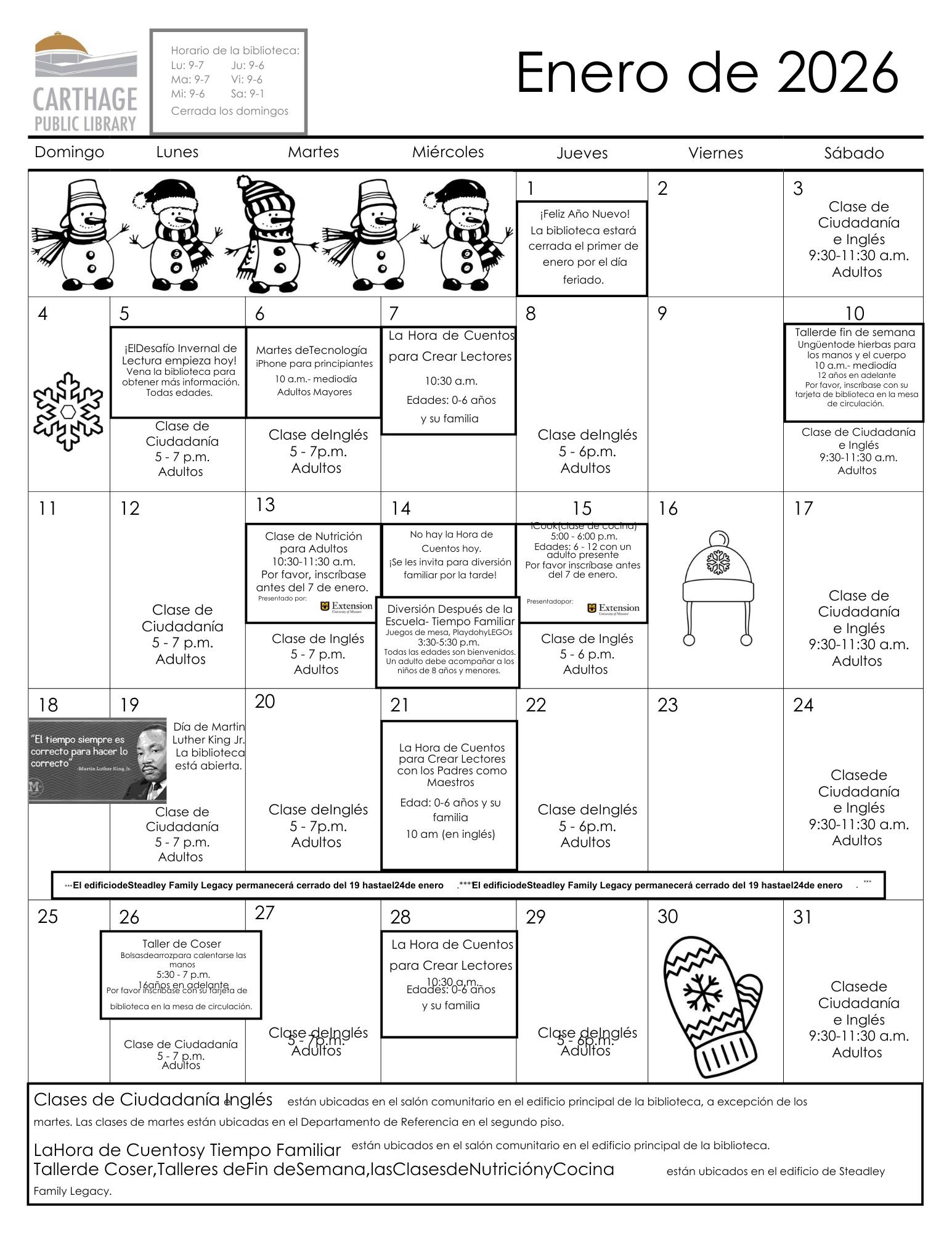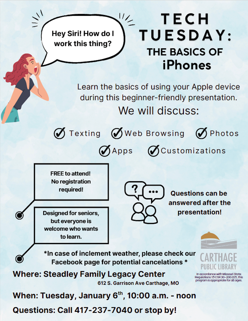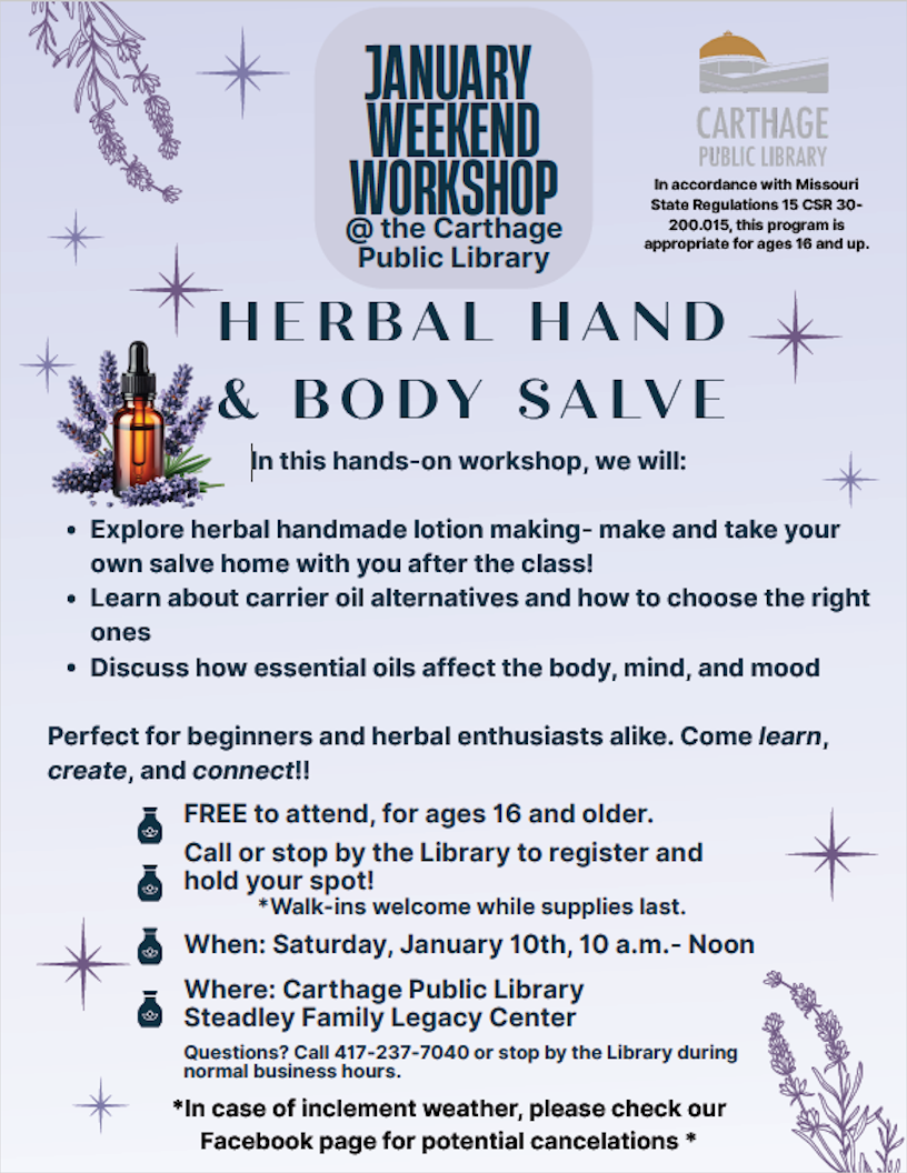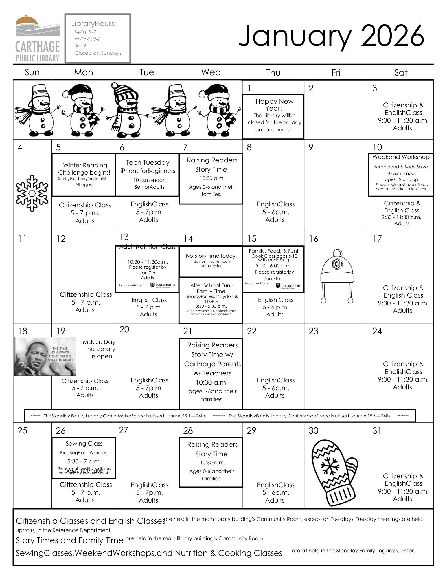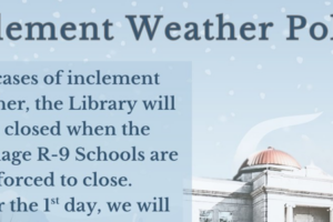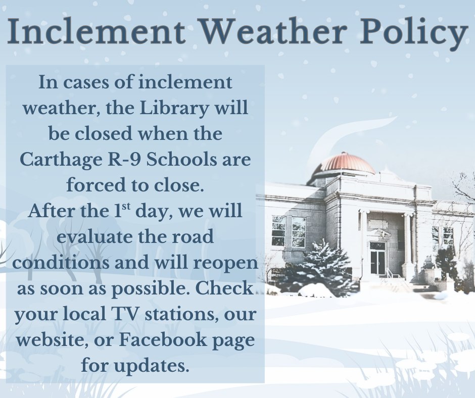In cases of inclement weather, the Library will be closed when the Carthage R-9 Schools are forced to close. After the first day, we will evaluate the road conditions and will reopen as soon as possible. Check your local TV stations, our website, or Facebook page for updates.