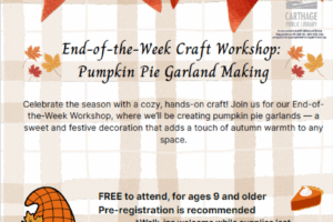 Craft Workshop: Pumpkin Pie Garland Making Calendar Add to Calendar Add to Timely Calendar Add to Google Add to Outlook Add to Apple Calendar Add to other calendar Export to XML When: November 24, 2025 @ 5:00 pm – 7:00 pm 2025-11-24T17:00:00-06:00 2025-11-24T19:00:00-06:00