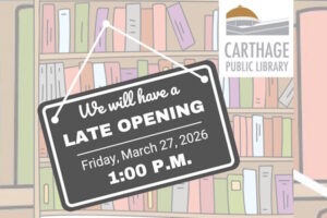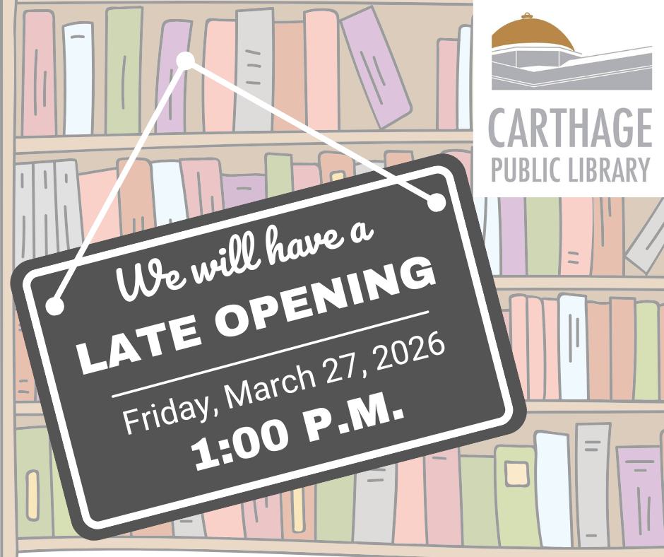 Late Opening at 1 PM, Friday, March 27, 2026 We will have a late opening on Friday, March 27, 2026 at 1 PM.